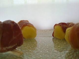 Cogemos cada una de estos bocaditos y los enrrollamos en media loncha de jamón.